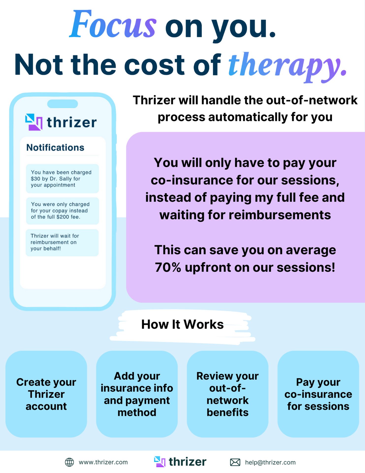 Most insurance companies will honor out of network reimbursement for their members; usually from 70-100%; check with your provider to clarify benefits before your session. I will present you with a superbill to present to your insurance company for reimbursement to you; payment will be the client's responsibility each session. I also partner with Thrizer, a company who assists clients and therapists with out of network reimbursement easily. If you would like to learn more, go to https://www.thrizer.com/ or check out the info below.